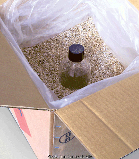 Fournie avec un sachet plastique adapté pour contenir les produits en cas de fuite ou de rupture du conditionnement primaire.