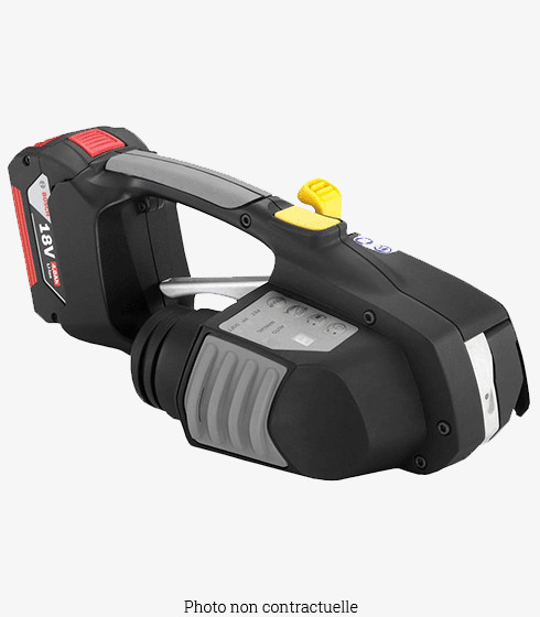 Ce combiné électrique à batterie assure la tension, la soudure par friction et la coupe du feuillard en un seul geste.